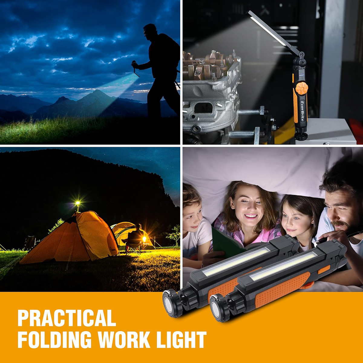 LED Rechargeable Work Light, 800LM COB Foldable Flashlight, Magnetic Work Lights with Hanging Hook, 360° & 270° Rotation – 2 Pack